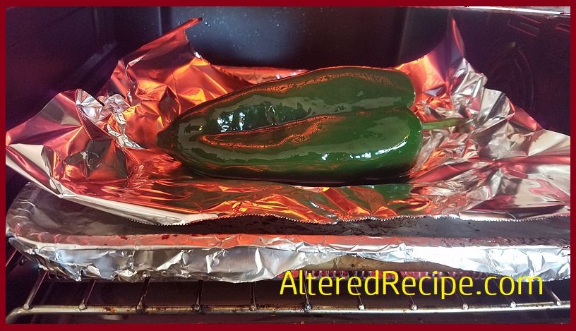 - If opting to roast your Pasilla, Poblano, or Red pepper, cover it with olive oil, place it on foil and bake for 20 minutes or so on 375. Turn the pepper every five minutes or so until black and bubbling. (I use the toaster oven to do this step.) When done, place into a bowl, cover it with seran wrap, and let it sweat for 10 minutes or so. This will help you get the skin off easier.